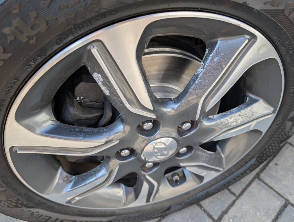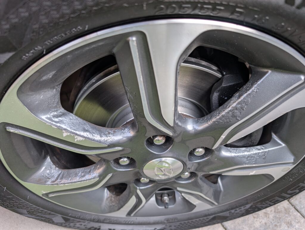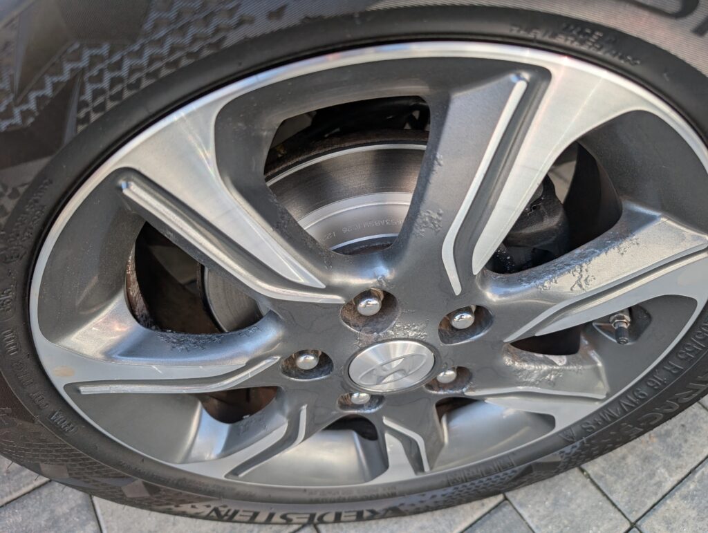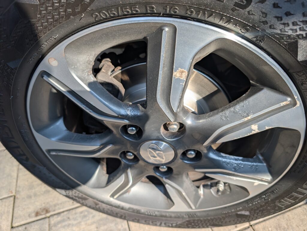 Na autě jsou originální litá kola 16" s celoročním obutím a jelikož jezdilo i v zimě je lak na alu kolech rozežraný od soli viz.foto - na funkčnost to nemá vliv je to jen kosmetická vada a nekvalitní nástřik od Hyundai